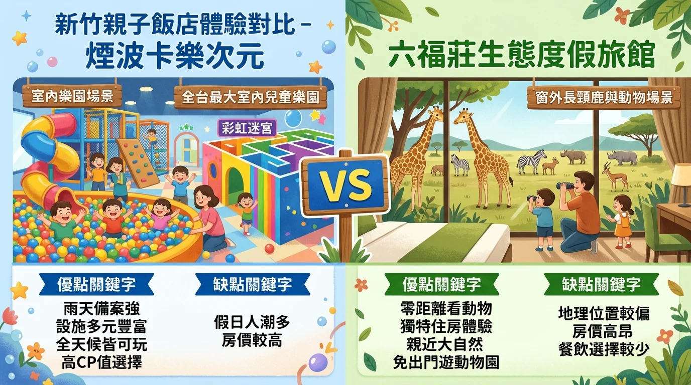 TL;DR: 新竹親子飯店首推煙波大飯店湖濱館(卡樂次元 2,300 坪室內樂園)和六福莊(全台唯一動物園住宿)。房價從平價 1,500 元到六福莊破萬都有,中價位 3,000-5,500 元 CP 值最高。