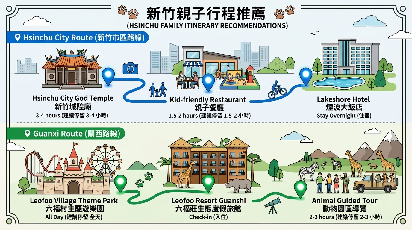 上午逛新竹市區(城隍廟、護城河親子公園)→ 中午吃親子餐廳 → 下午飯店 check in → 晚上飯店設施放電。適合選煙波或喜來登的家庭。