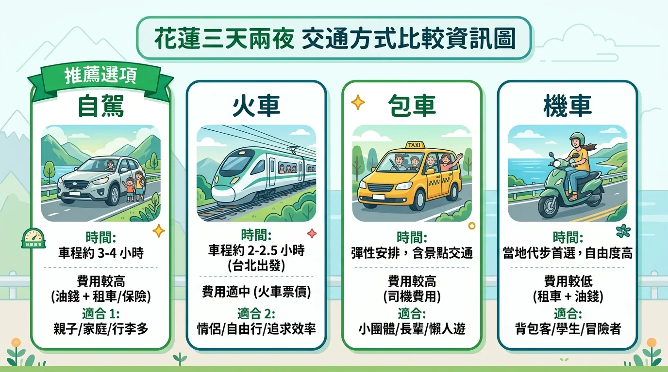 | 自駕開車 | 3-4 小時(蘇花改) | 油資+過路費約 1,500 | 最高 | 帶小孩首選 |