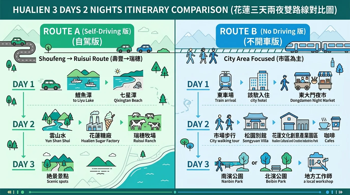 A: 搭太魯閣號到花蓮約 2 小時,住市區飯店步行就能逛夜市。搭配一天包車(約 3,500 元)跑太魯閣或海洋公園,其餘時間在市區走路就好,完全不需要開車。