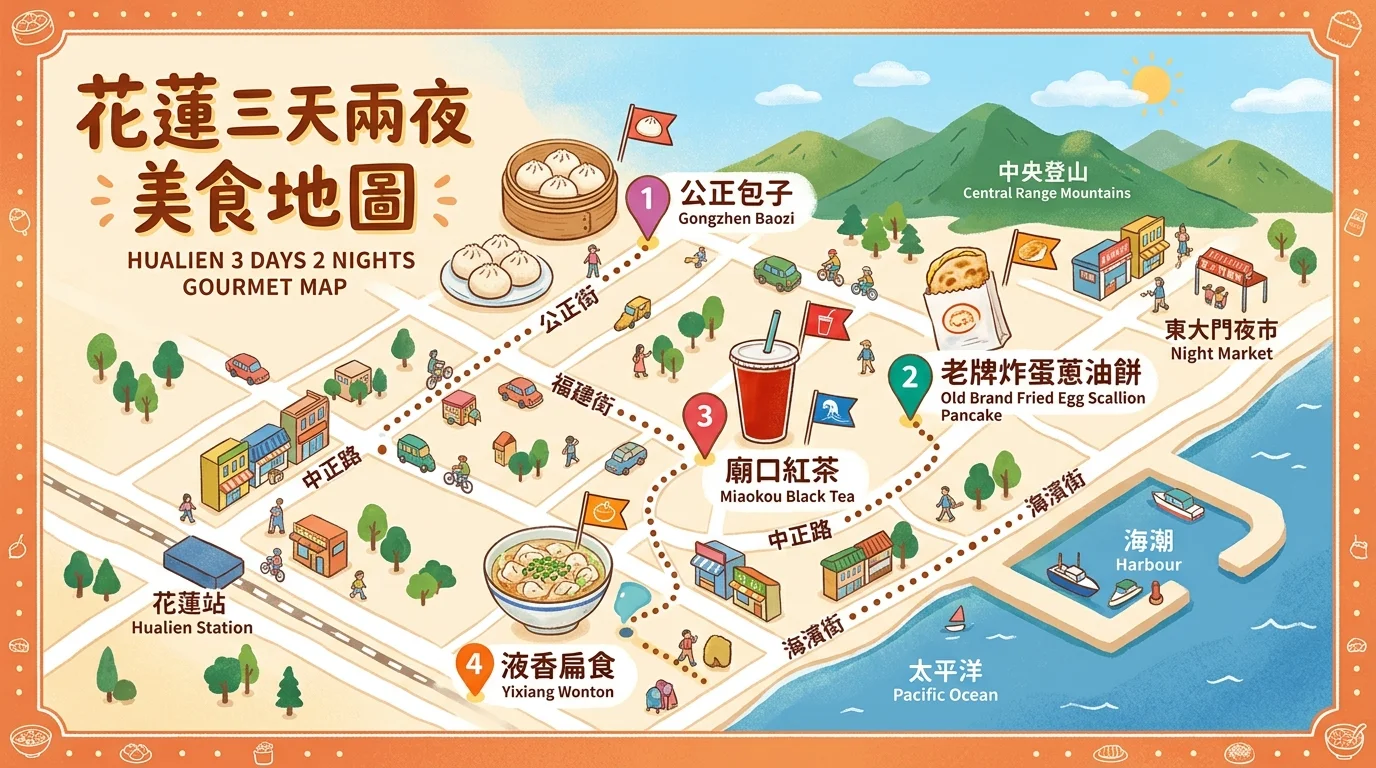 早上不趕行程。在飯店吃完早餐,再泡最後一次溫泉。退房後回程走花蓮市區,安排 2-3 間必吃美食: