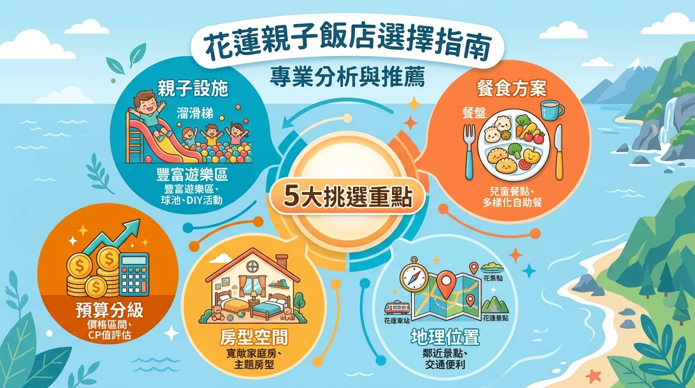 根據我們實際走訪花蓮超過 15 間親子飯店的經驗,超過 8 成的爸媽最在意的五件事依序是:親子設施、餐食方案、地理位置、房型空間跟價格(交通部觀光署旅宿網, 2025)。把這五點搞定,基本上不會踩雷。