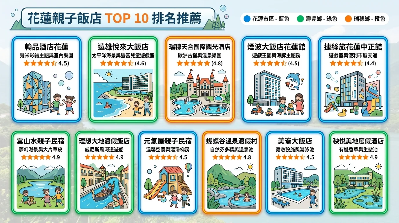 這篇幫你整理 2026 年花蓮最值得住的 10 間親子飯店,從市區到瑞穗、從平價到五星,每間都有真實的設施評比跟價格比較,看完就能直接訂房出發。