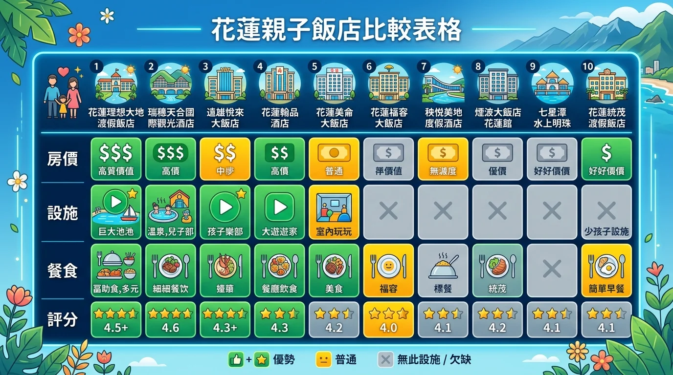 直接看表最快。以下是 2026 年 10 間花蓮親子飯店的重點比較: