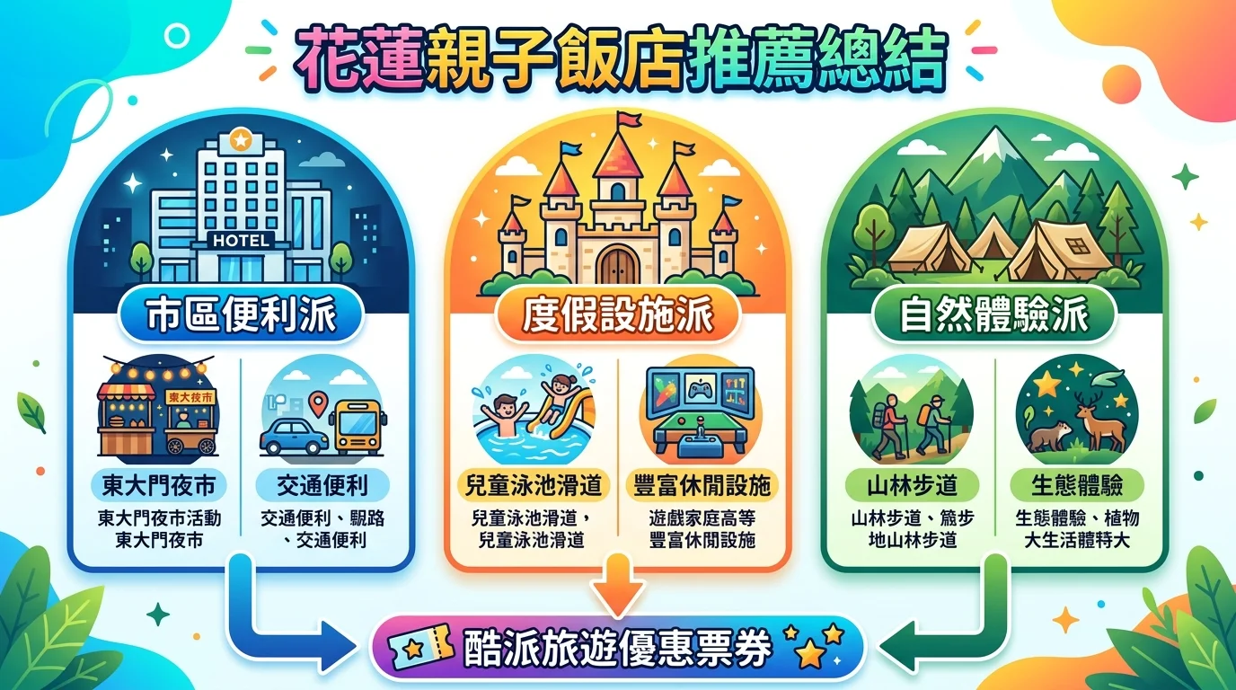 TL;DR: 花蓮親子飯店首推福容花蓮(市區方便、CP 值高)和瑞穗天合(五星設施、溜滑梯城堡房)。透過酷派旅遊票券訂房最低 2 折起,買了半年內有效,想住再約超彈性。趕時間的爸媽 👉 直接看花蓮飯店優惠方案