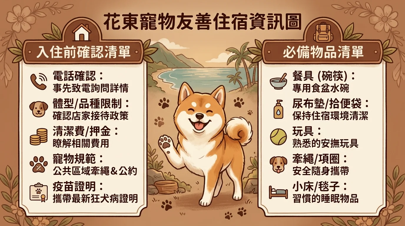 A: 有。花蓮有多間飯店跟民宿接受寵物入住,部分還提供寵物備品跟活動空間。但規定各家不同,體型限制、清潔費都要事先電話確認。建議不要只看官網,打電話問最準確。