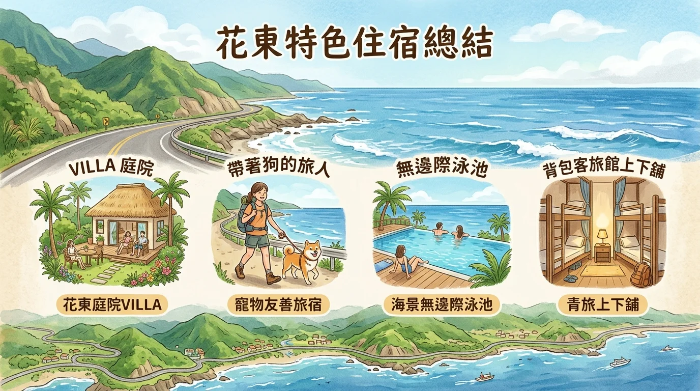 花東的住宿選擇遠比你想像的多元。不是只有飯店這個選項——Villa 包棟讓多家庭同遊更自在,寵物友善住宿讓毛小孩不用被丟在家,無邊際泳池飯店讓度假感直接拉滿,背包客旅館則讓預算不再是阻礙。