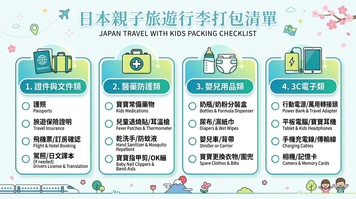 第一次帶小孩去日本,心裡既興奮又緊張?2025 年台灣赴日旅客達 676 萬人次,較前年成長 11.9%,創下歷史紀錄(聯合新聞網, 2026)。 全年訪日旅客達 4,270 萬人次,觀光消費總額 9.5 兆日圓,雙創歷史新高(中央社, 2026)。 外國旅客人均消費約 22.9 萬日圓(約新台幣 4.8 萬元),住宿佔消費額最大比重(訪日ラボ, 2026)。 越來越多台灣家庭選擇帶小孩去日本旅遊。別擔心。護照、保險、行李、交通、住宿——聽起來很多對吧?其實只要照著清單一項一項準備,比你想像的簡單。