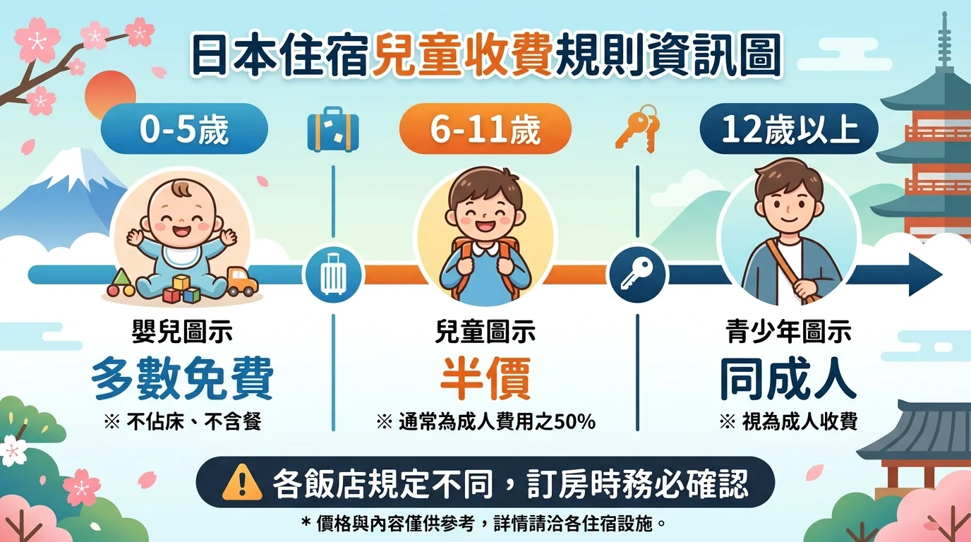 大通則:0-5 歲不加床免費、6-11 歲半價、12 歲以上同成人。但各家差異大,有的 6 歲以下免費、有的 12 歲以下免費。商務飯店通常比較寬鬆。