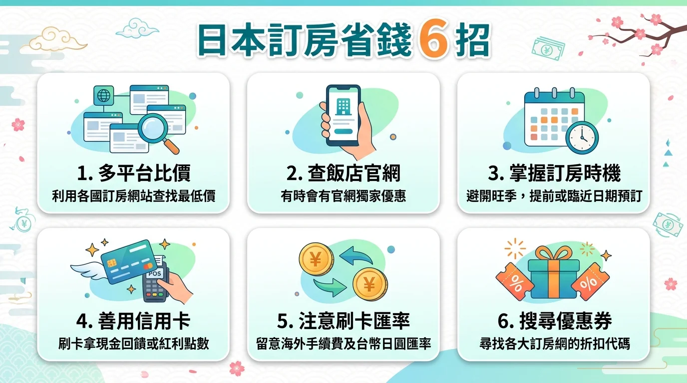 TL;DR: 日本訂房至少同時比 3-4 個平台,同一間飯店價差可達 20%。親子旅遊提早 2-3 個月訂房最安全,善用信用卡海外消費回饋等於再打 97-98 折。記得比較的是含稅含服務費的「總價」。