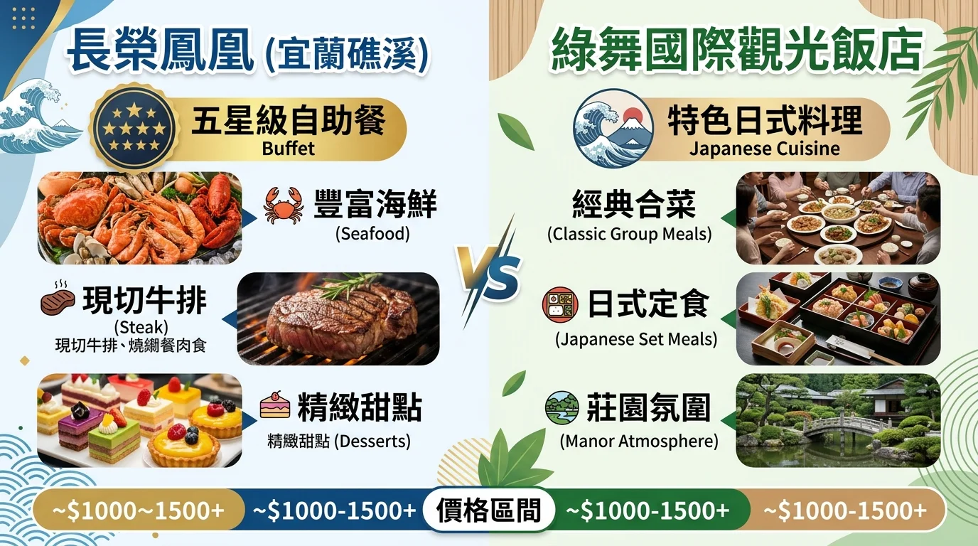 A: 高預算推薦長榮鳳凰——五星 Buffet 菜色豐富,拆開算比含餐方案貴 2,000-3,000 元。中預算推薦綠舞——日式莊園氛圍加分。低預算推薦四季溫泉——雙人含餐平日不到 3,000 元就能泡湯吃飯,是 CP 值之王。