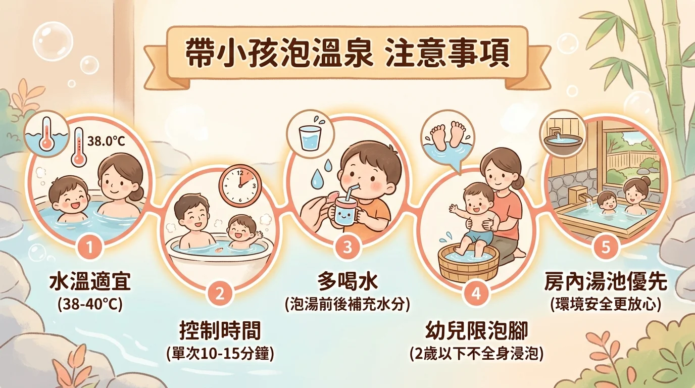 - 水溫控制在 38-40 度以下(飯店大眾池通常 40 度以上,不適合幼兒)