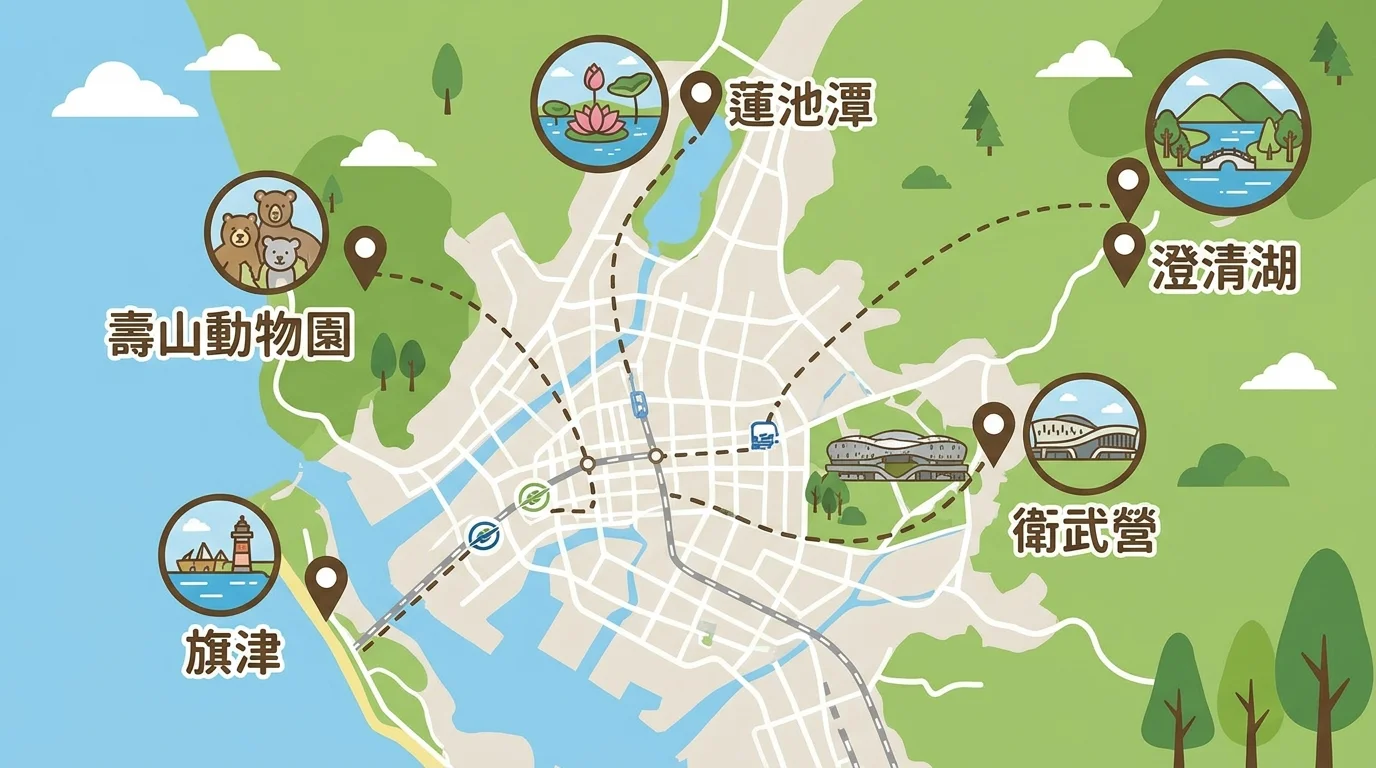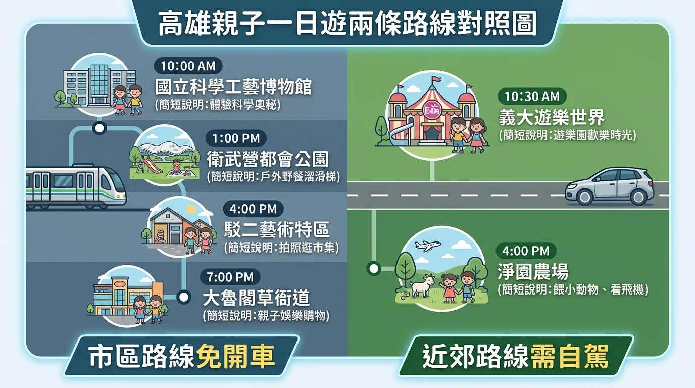 A: 高雄親子景點分三大類:戶外(壽山動物園、旗津、蓮池潭)、室內(科工館、駁二)和遊樂園(義大、鈴鹿賽道)。搭捷運和輕軌就能到大部分景點,帶小孩出門很方便。