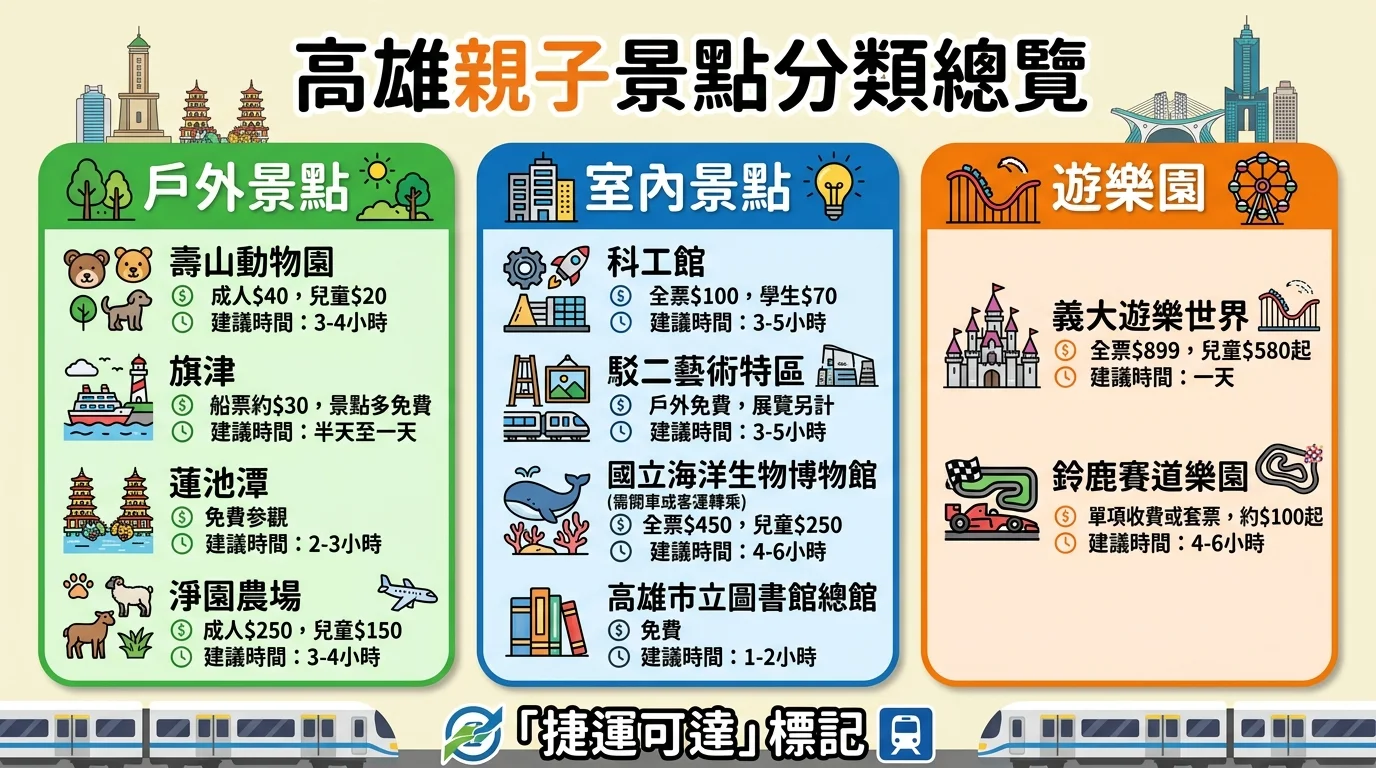 TL;DR: 高雄親子景點分戶外(壽山動物園、旗津、蓮池潭)、室內(科工館、駁二)和遊樂園(義大、鈴鹿)三大類。雨天首選科工館,晴天首選旗津海灘。搭捷運和輕軌就能串聯大部分景點。