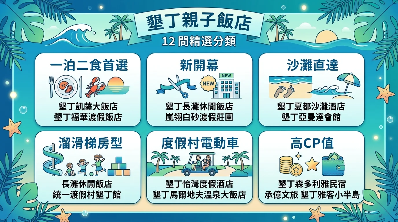 墾丁國家公園 2024 年到訪人次約 390 萬,沙灘飯店和一泊二食方案最受親子家庭歡迎(墾丁國家公園管理處, 2025)。按照特色分類介紹,方便你快速找到最適合的那一間。