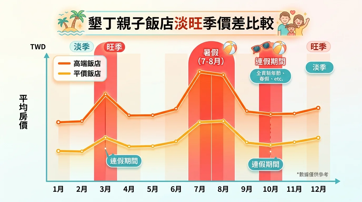 墾丁的淡旺季價差非常誇張。同一間飯店、同一個房型:
