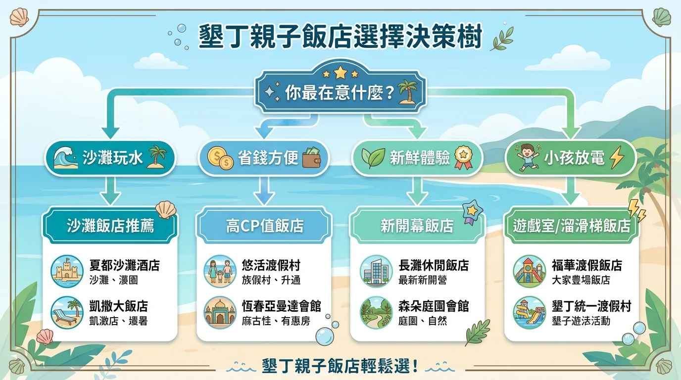 TL;DR: 墾丁親子飯店首選有沙灘直達的度假型飯店,一泊二食方案帶小孩最省心。住墾丁大街周邊生活機能好但較吵,南灣和船帆石比較安靜。用電子票券訂房比 OTA 便宜,淡季出遊更划算。