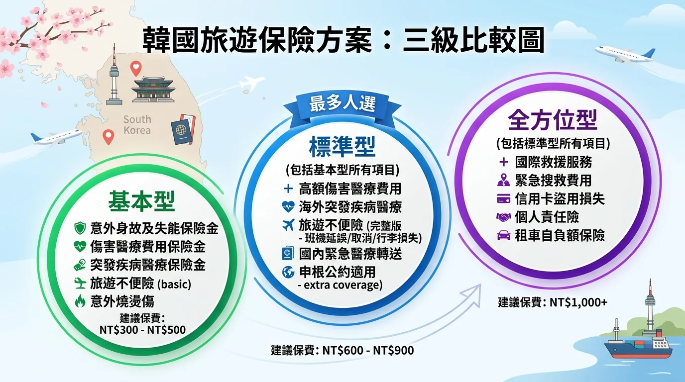 A: 3-5 天韓國快閃建議選標準型方案,保費約 200-300 元,確保有海外醫療保障(至少 50 萬)和班機延誤保障即可。不需要選到全方位型,保費省下來多吃一頓烤肉更實在。