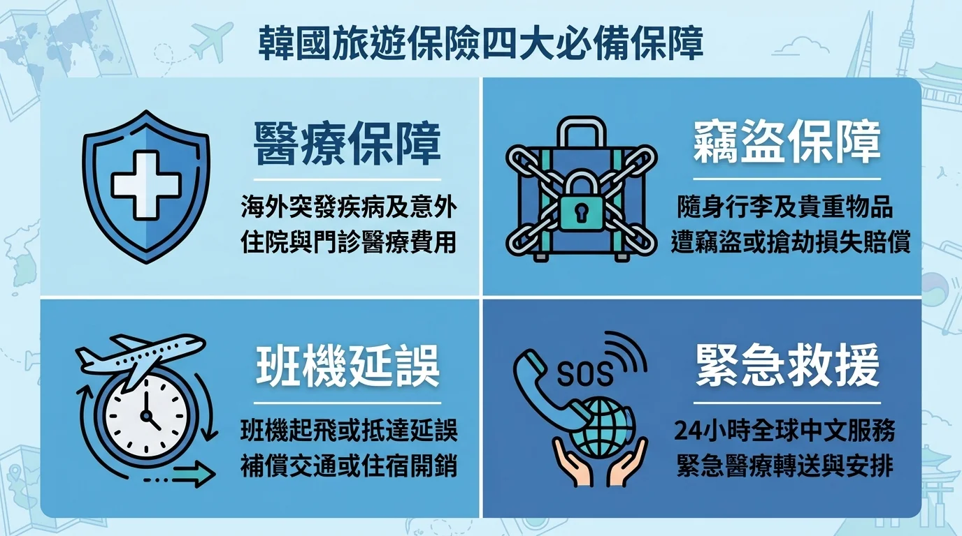 TL;DR: 韓國沒有強制旅遊保險規定,但醫療費用比台灣貴 3-10 倍,強烈建議投保。短天數(3-5 天)保費約 150-300 元,長天數(7 天以上)約 300-600 元。必備保障是海外醫療(建議至少 50 萬),其次是班機延誤和個人物品竊盜。
