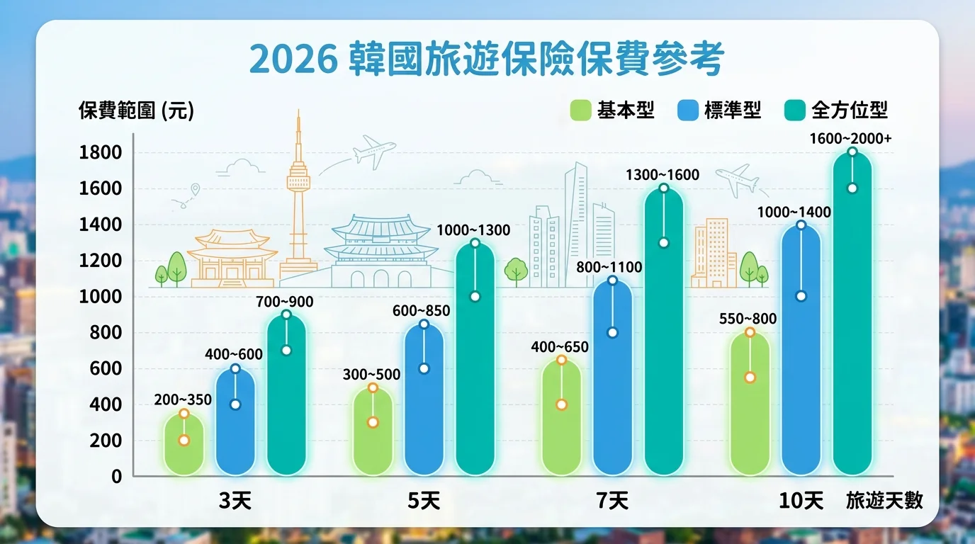 短天數 3-5 天韓國行程保費約 150-300 元,長天數 7 天以上約 300-600 元,跟一頓韓式烤肉差不多。去韓國最常見的行程分兩種:快閃和深度遊,推薦方案也不一樣。