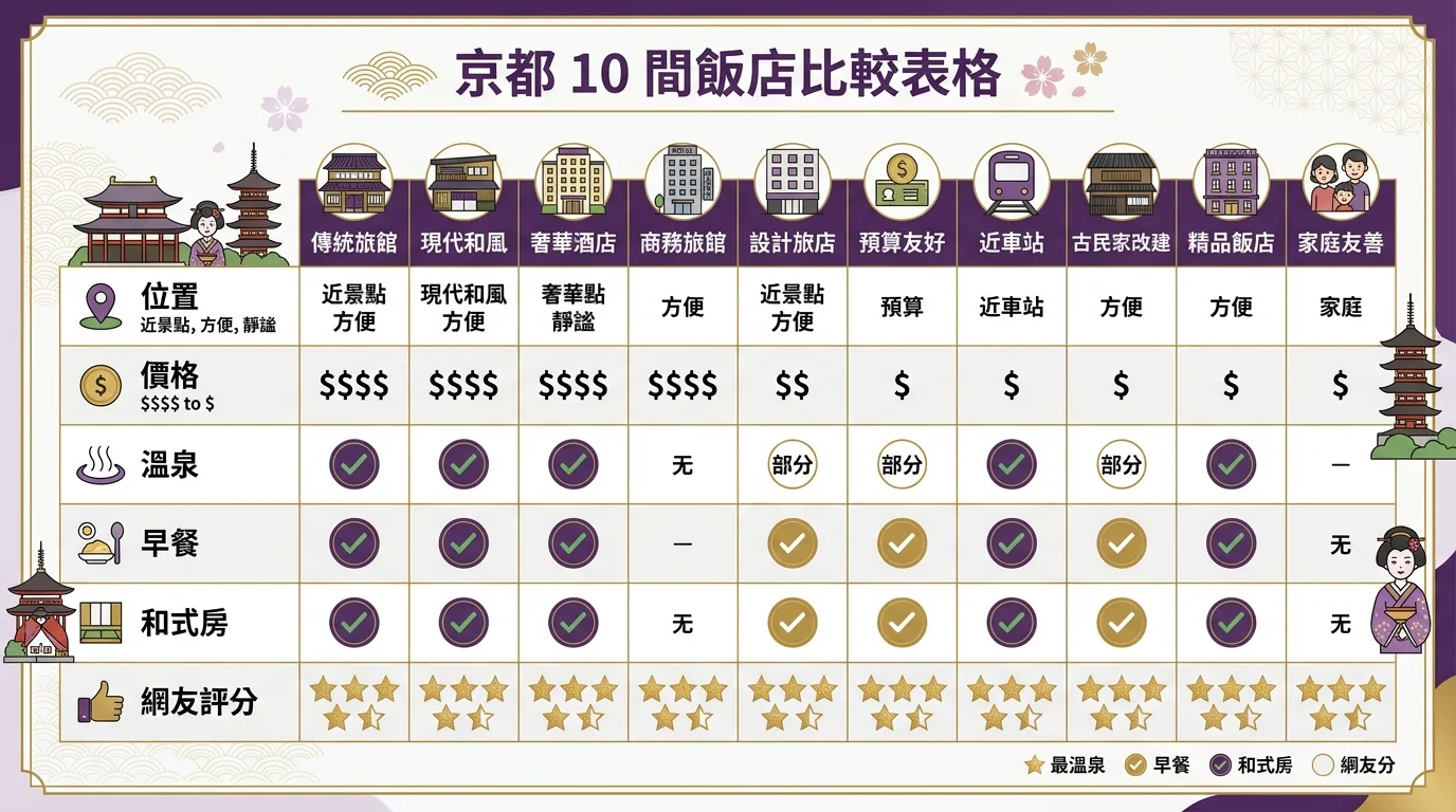TL;DR: 京都親子住宿首推京都車站周邊(交通最方便)、四條河原町(逛街便利),京都飯店一晚約 3,500-10,000 台幣,旺季(櫻花季、紅葉季)會漲 30-50%,記得額外準備城市稅(每晚 200-1,000 日圓)。
