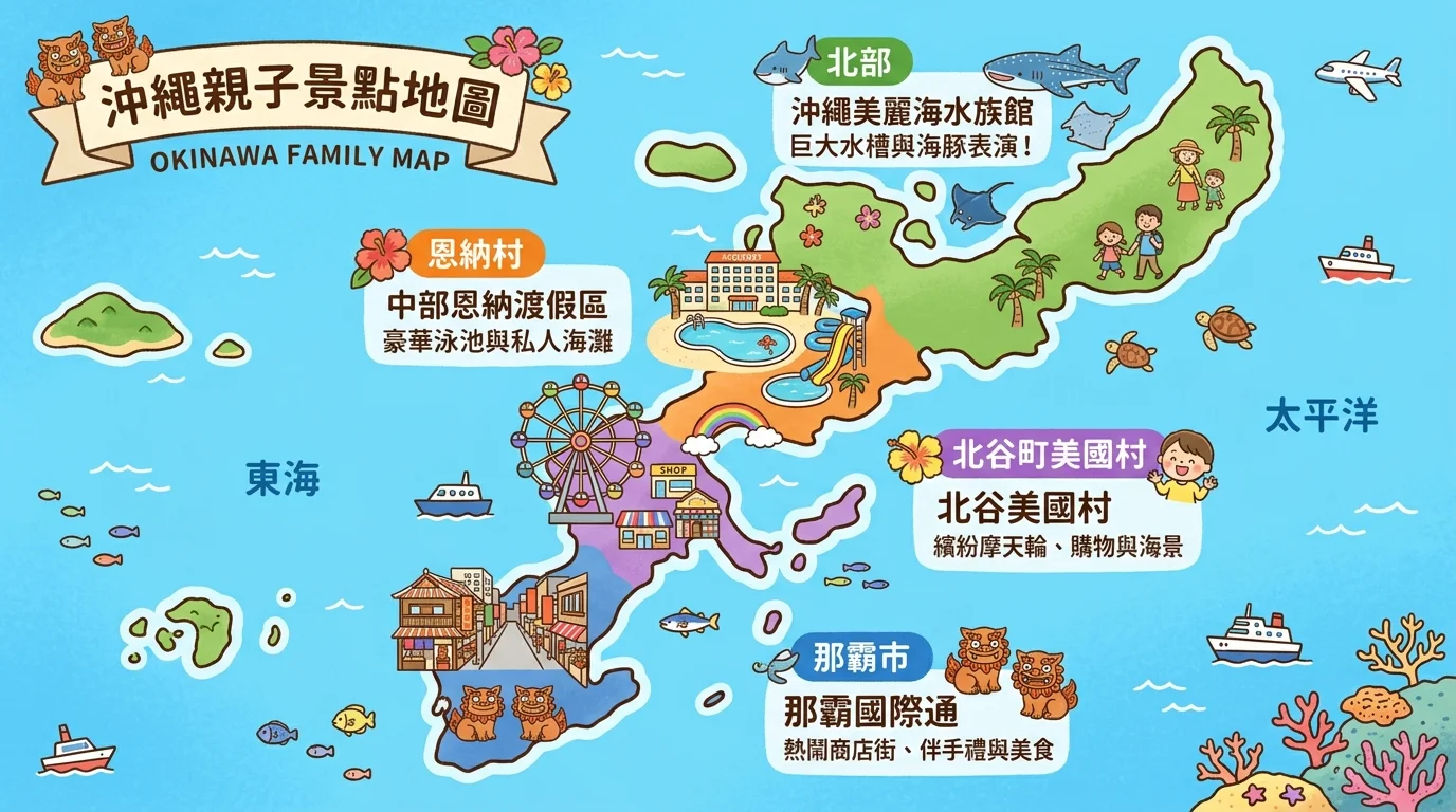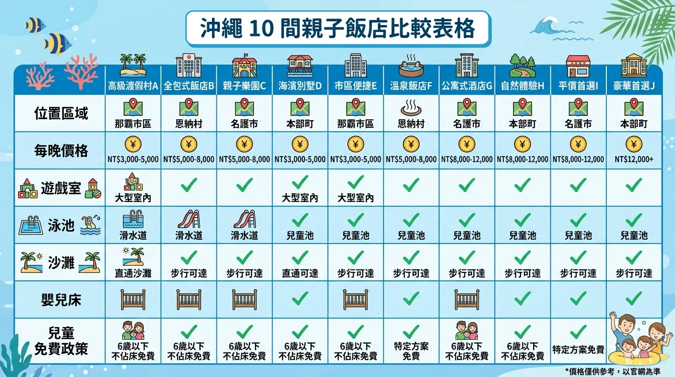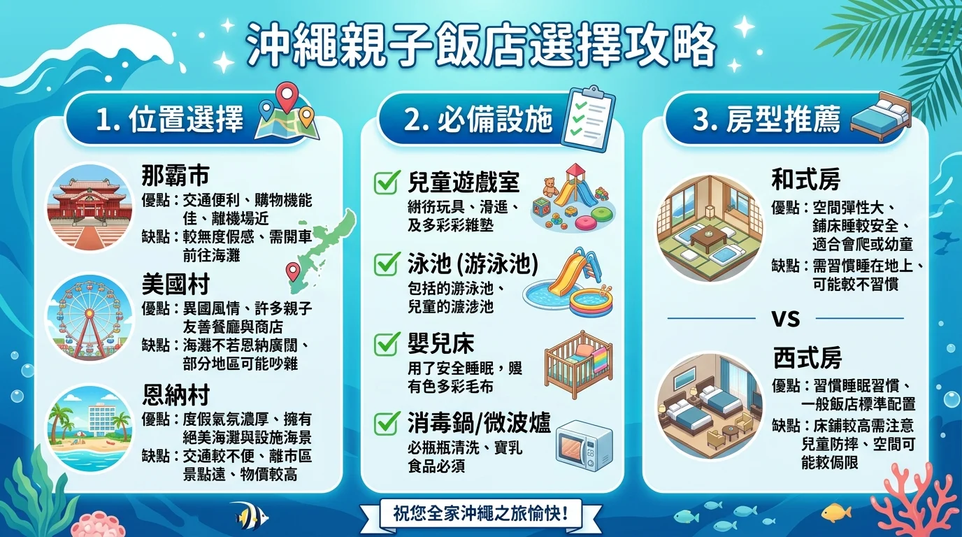 TL;DR: 沖繩親子飯店首選恩納海岸度假村(設施最完善)、美國村周邊(逛街方便)、那霸市區(交通便利),帶嬰幼兒推薦榻榻米和式房,6 歲以下不加床多數免費。