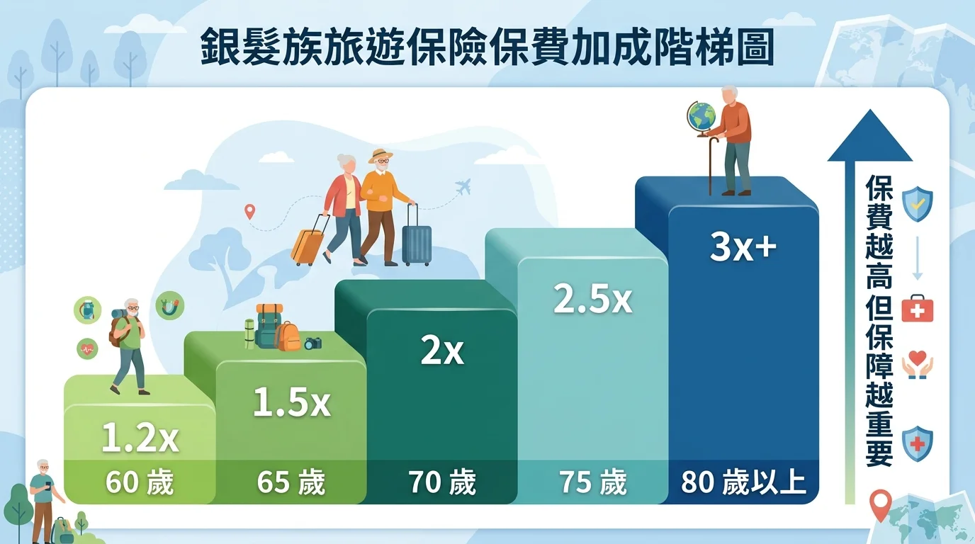 60 出頭其實還算好處理。大多數保險公司的旅遊保險都接受這個年齡段投保,保費比一般成人貴 20-50%,保障範圍差異不大。