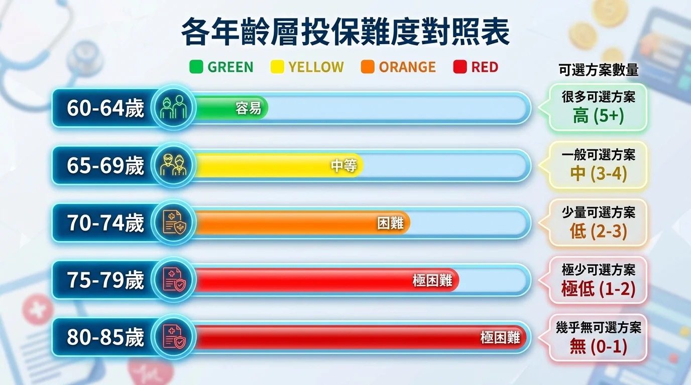 | 70-74 歲 | 約 2-2.5 倍 | 可選方案也變少 |