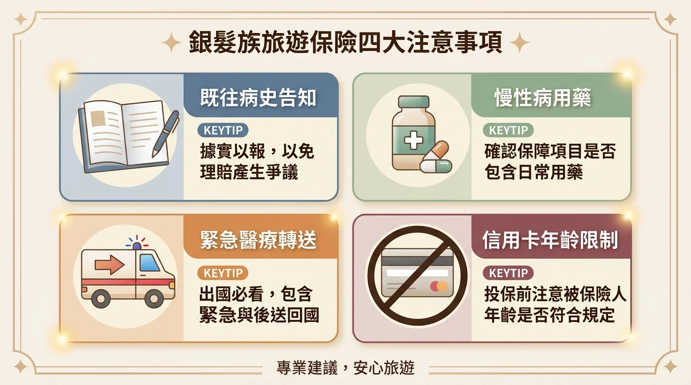 60 歲以上旅遊保險保費約加成 1.5-3 倍,但比起國外動輒數十萬的住院費用,這筆錢絕對值得。年紀越大身體狀況越不穩定,時差、氣候變化、飲食不同都可能讓原本穩定的身體出狀況。