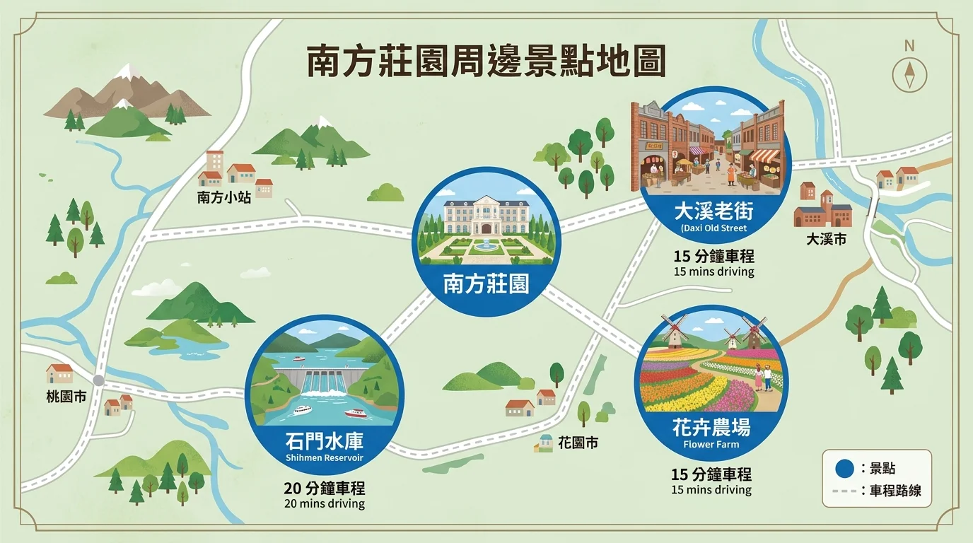TL;DR: 南方莊園最推薦一泊二食方案(含早晚餐 + 溫泉泳池),在酷派旅遊訂比官網便宜。附近有大溪老街(15 分鐘)和石門水庫(20 分鐘),適合安排兩天一夜。