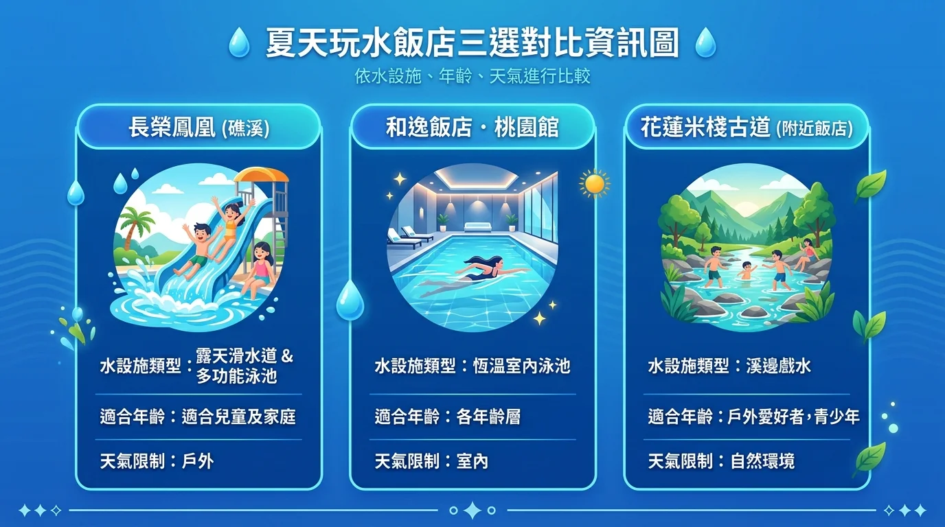 A: 首推礁溪長榮鳳凰(露天滑水道+噴水設施)、和逸桃園館(室內泳池不怕下雨)、花蓮壽豐米棧(天然溪邊戲水)。三間的水設施類型不同,可依小孩年齡和偏好選擇。搭配酷派旅遊票券最低 2 折起。