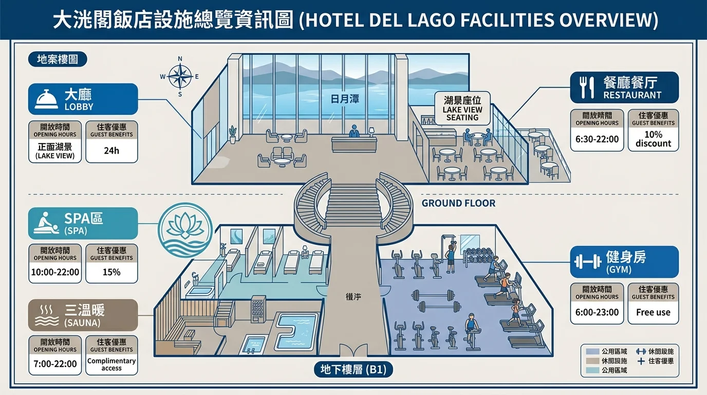 公共設施整體來說中規中矩。不算特別豐富,但作為休閒補充已經足夠。如果你很看重飯店設施(泳池、遊戲室、健身房),大淶閣可能不夠。這方面雲品和涵碧樓確實好很多,但價差也是好幾倍。