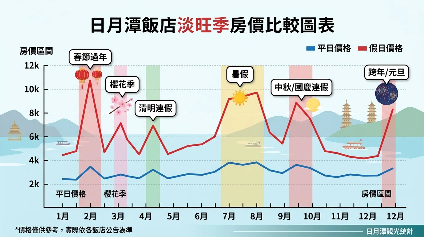 日月潭飯店的旺季集中在暑假(7-8月)、連假和跨年,房價約為平日的 1.5-2 倍。舉個例子,大淶閣的湖景房平日大概 3,000-4,000 元,週末可能要 5,000-6,000 元,春節更是直接翻倍。