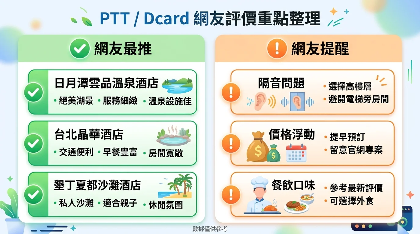 飯店自己說好不算數,要看住過的人怎麼說。我們整理了 PTT 和 Dcard 上最新的日月潭飯店討論串,幫你抓出重點。