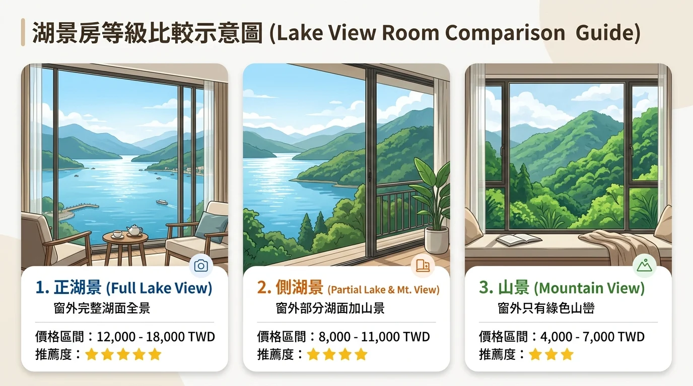 湖景房比山景或一般房通常貴 30-50%。以大淶閣為例,平日的價差大概在 1,000-2,000 元之間。這筆錢換來的,是每次走進房間都會被窗外的景色驚艷到的感覺。