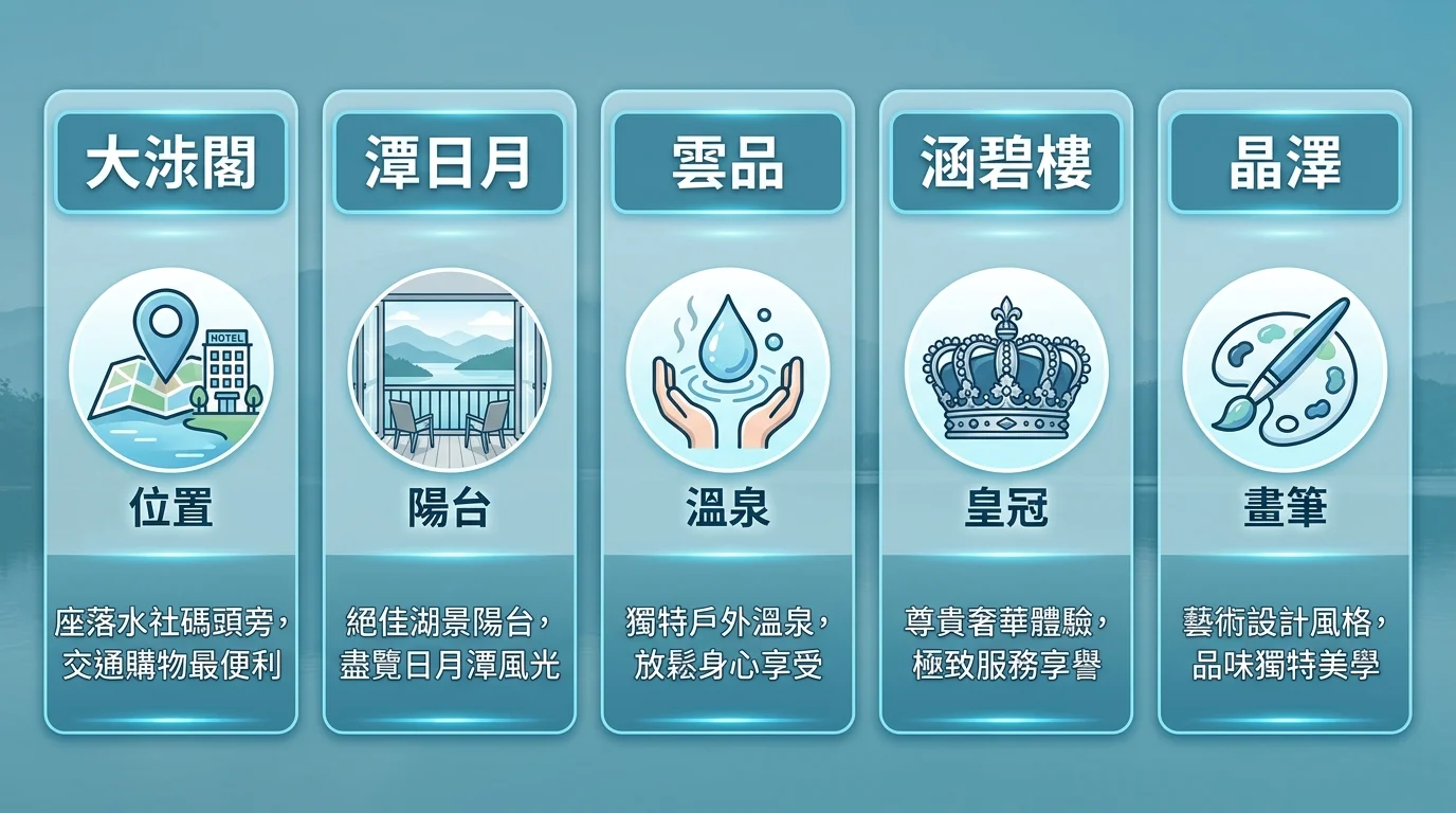 我們實際比較了五間飯店的設施和服務後發現:雲品在設施完整度上最突出,涵碧樓在服務品質上最頂級。大淶閣和晶澤設施相對簡約,但地理位置和房間品質很有競爭力。