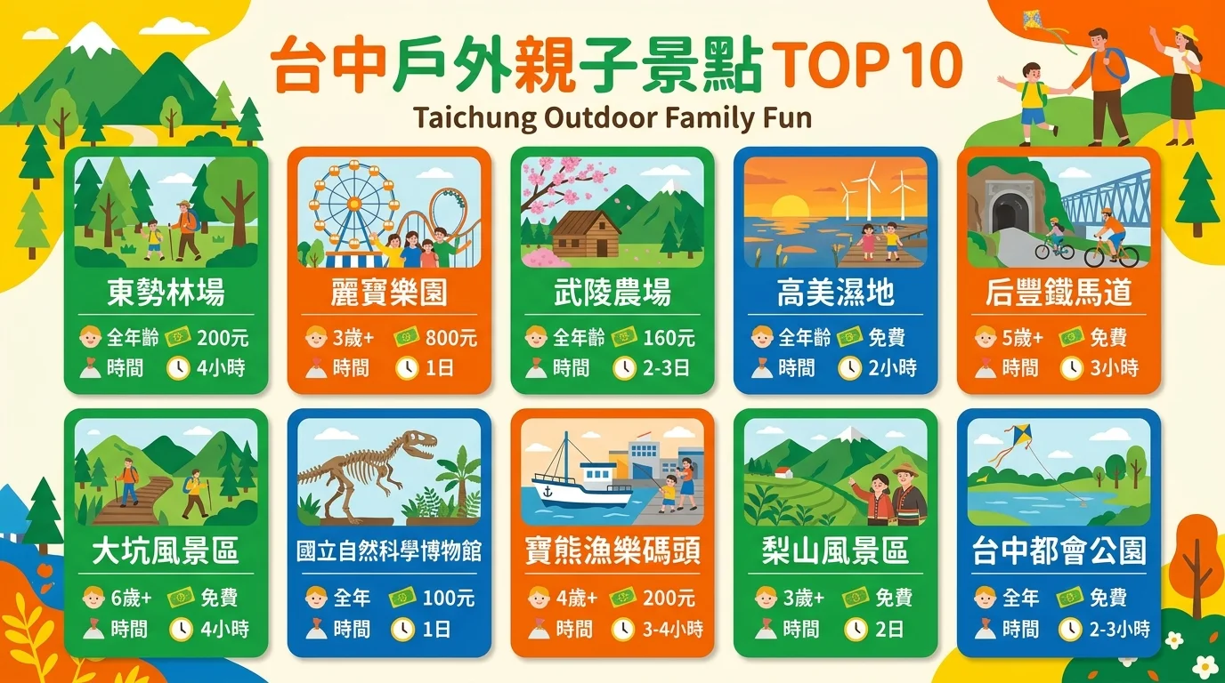 A: 高美濕地、東海牧場、新社花海(季節限定)、國美館兒童遊戲室、柳川水岸、望高寮、彩虹眷村都是免費景點。台中免費親子景點選擇很多,不花錢也能玩一整天。