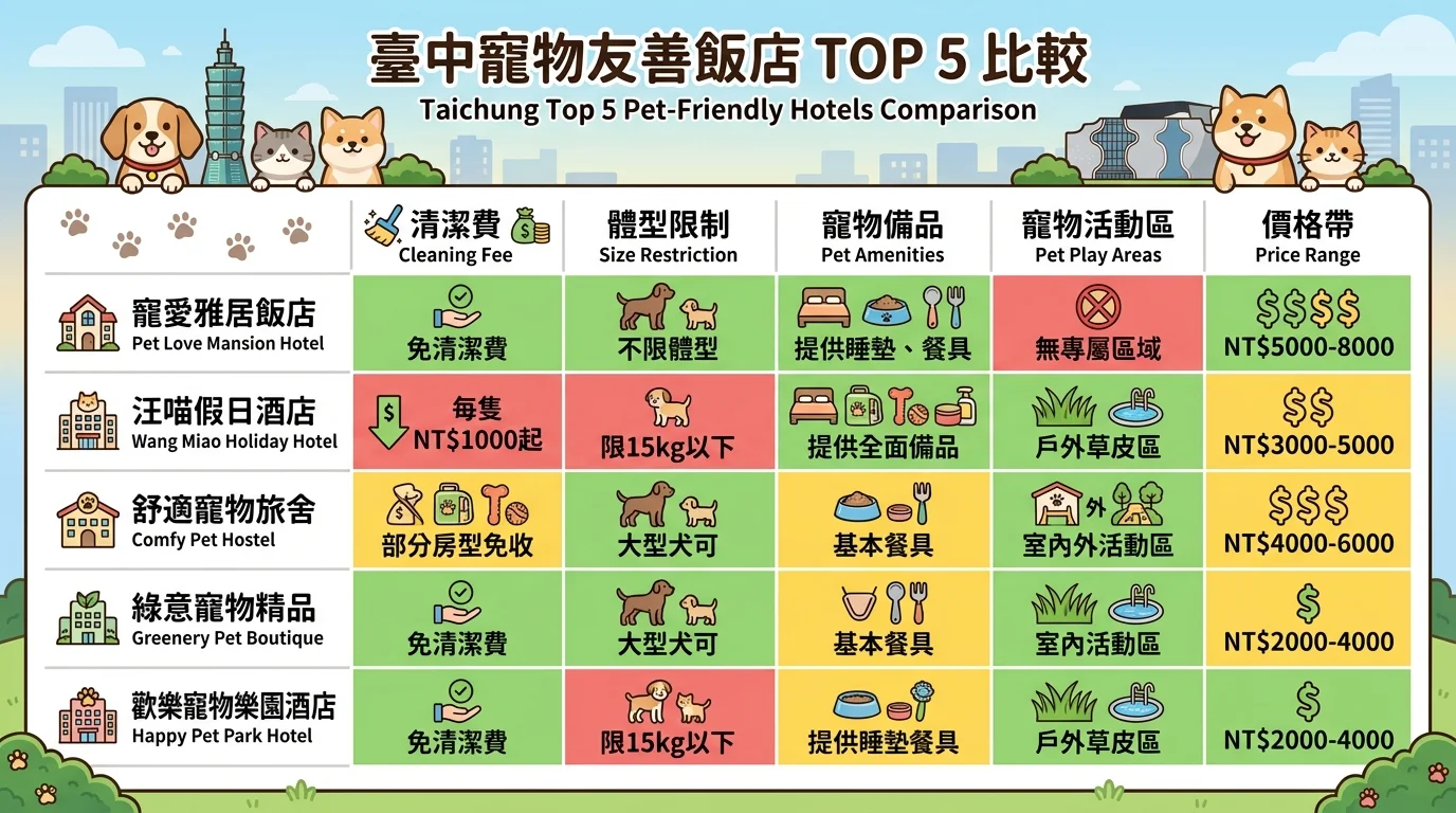 TL;DR: 台中寵物友善飯店推薦蘭那泰式文化度假酒店(免加價、備品最齊全)、清新溫泉飯店(有寵物活動區)、谷關麒麟峰溫泉會館(溫泉+寵物)。寵物友善飯店台中大多限 10-15 公斤以下,清潔費 0-1,500 元不等。入住前務必確認最新規定。