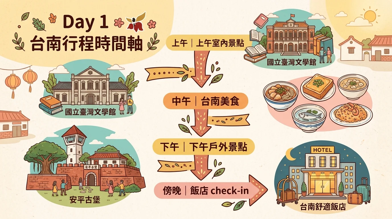 - 安平古堡和安平老街:經典路線,小孩可以吃蝦餅、看古蹟。老街上有各種小吃和紀念品,邊走邊逛很有趣。
