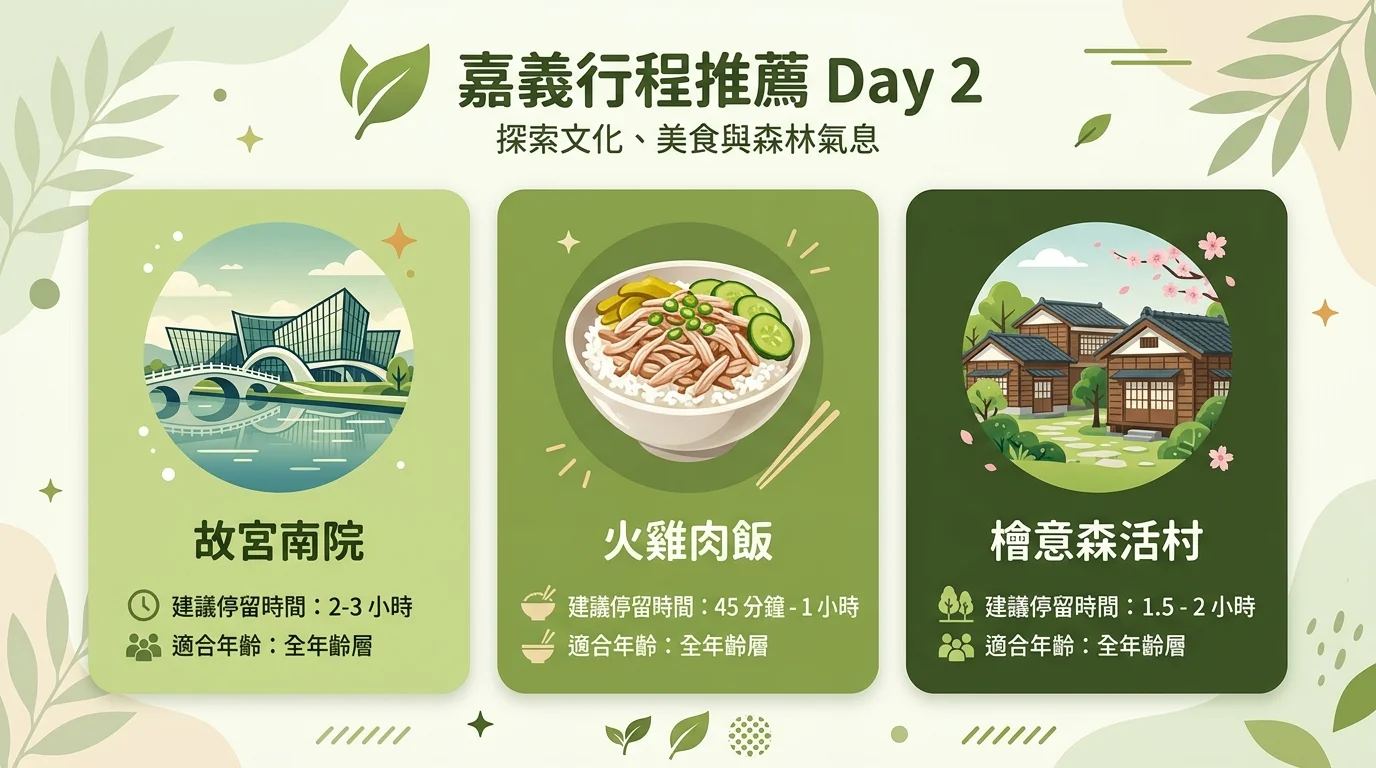 A: Day 1 台南景點 + 親子飯店過夜,Day 2 嘉義景點 + 美食,下午 3-4 點輕鬆返程。台南到嘉義車程約 1 小時,建議一天排 2-3 個景點就好。