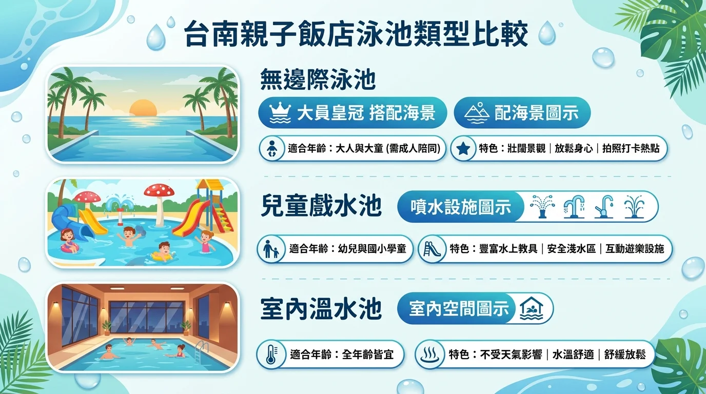 A: 大員皇冠有無邊際泳池(台南最知名)、晶英酒店有室內泳池、禧榕軒有戶外泳池。帶 2 歲以下寶寶建議選有兒童戲水區的飯店,水深 30 公分以下最安全。