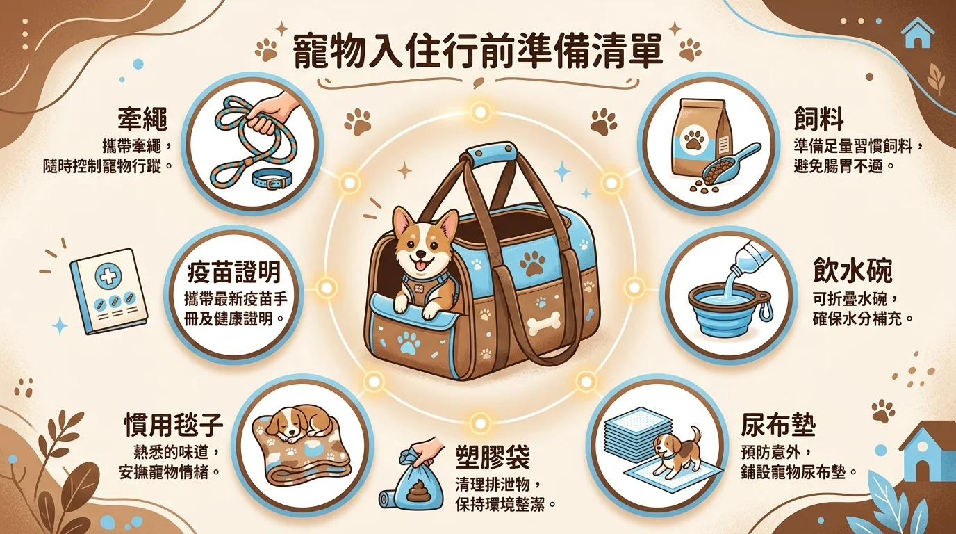 A: 必備物品包括牽繩、足量飼料、飲水碗、寵物尿布墊、塑膠袋(撿便便用)。建議另外帶毛孩慣用的毯子或玩具減少換環境焦慮,以及狂犬病疫苗注射證明影本(部分飯店會要求出示)。飯店備品不一定齊全,自己帶比較保險。