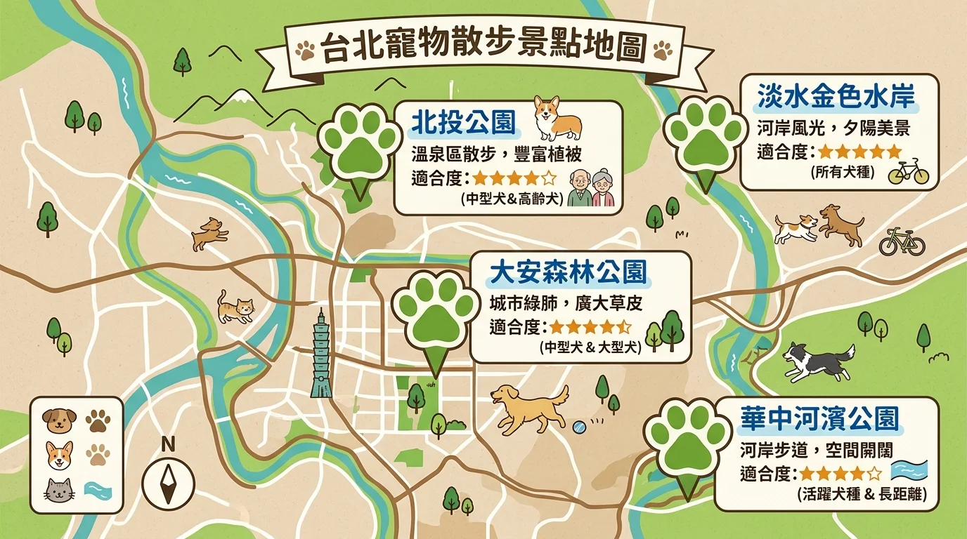 - 大安森林公園:市中心最大綠地,有寵物活動專區