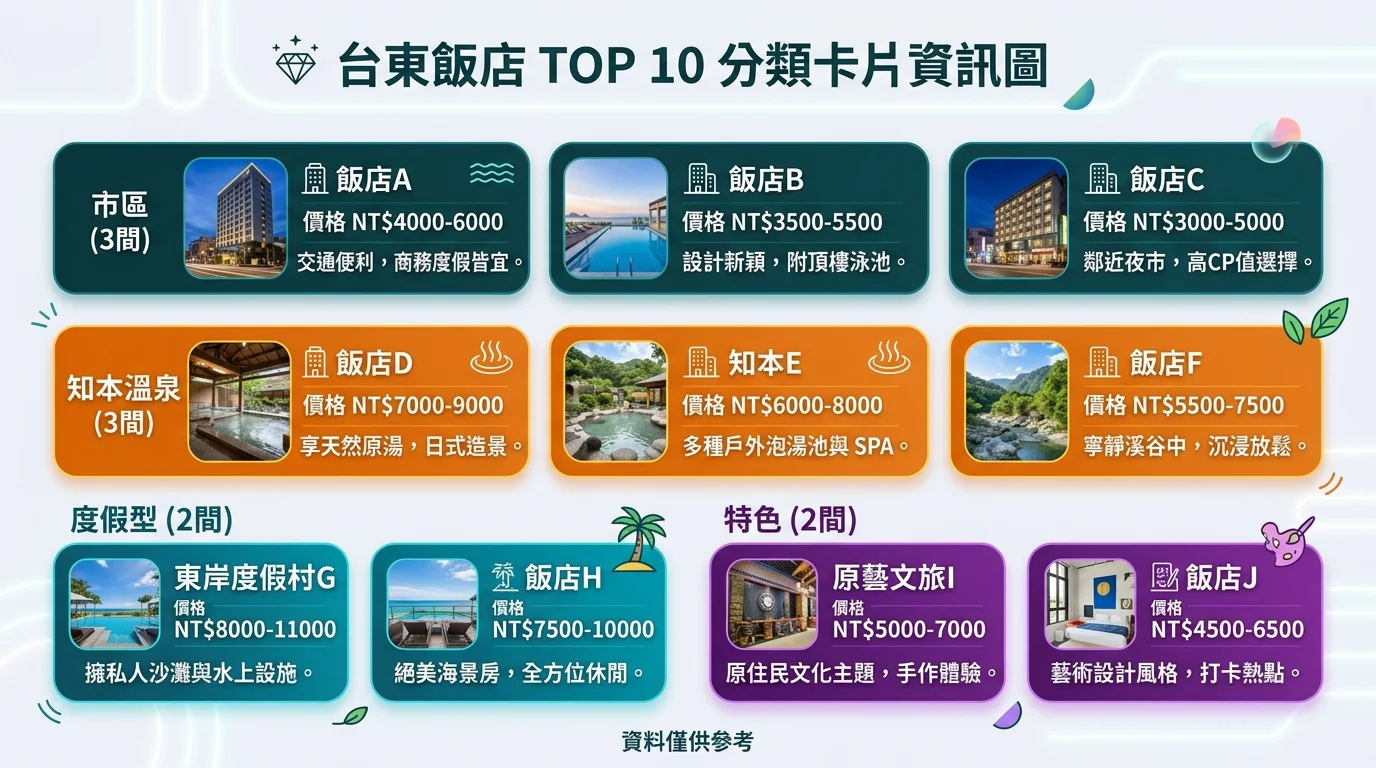 這篇幫你把功課做好了。從市區到知本、從五星到平價,10 間飯店的真實評價、房價比較、PTT 跟 Dcard 網友心得全部整理好,看完直接選就對了。