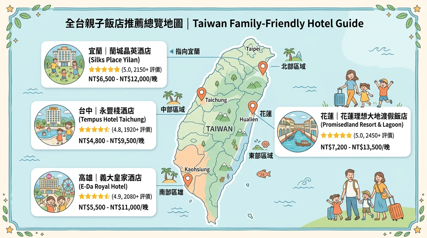 TL;DR: 台灣各區域都有豐富的親子景點。北部交通方便適合快閃、中部自然生態豐富四季皆宜、南部陽光海灘美食一次滿足、東部自然壯闊適合放慢腳步。本篇依區域精選推薦景點,搭配住宿建議和優惠連結,讓你看完直接出發。