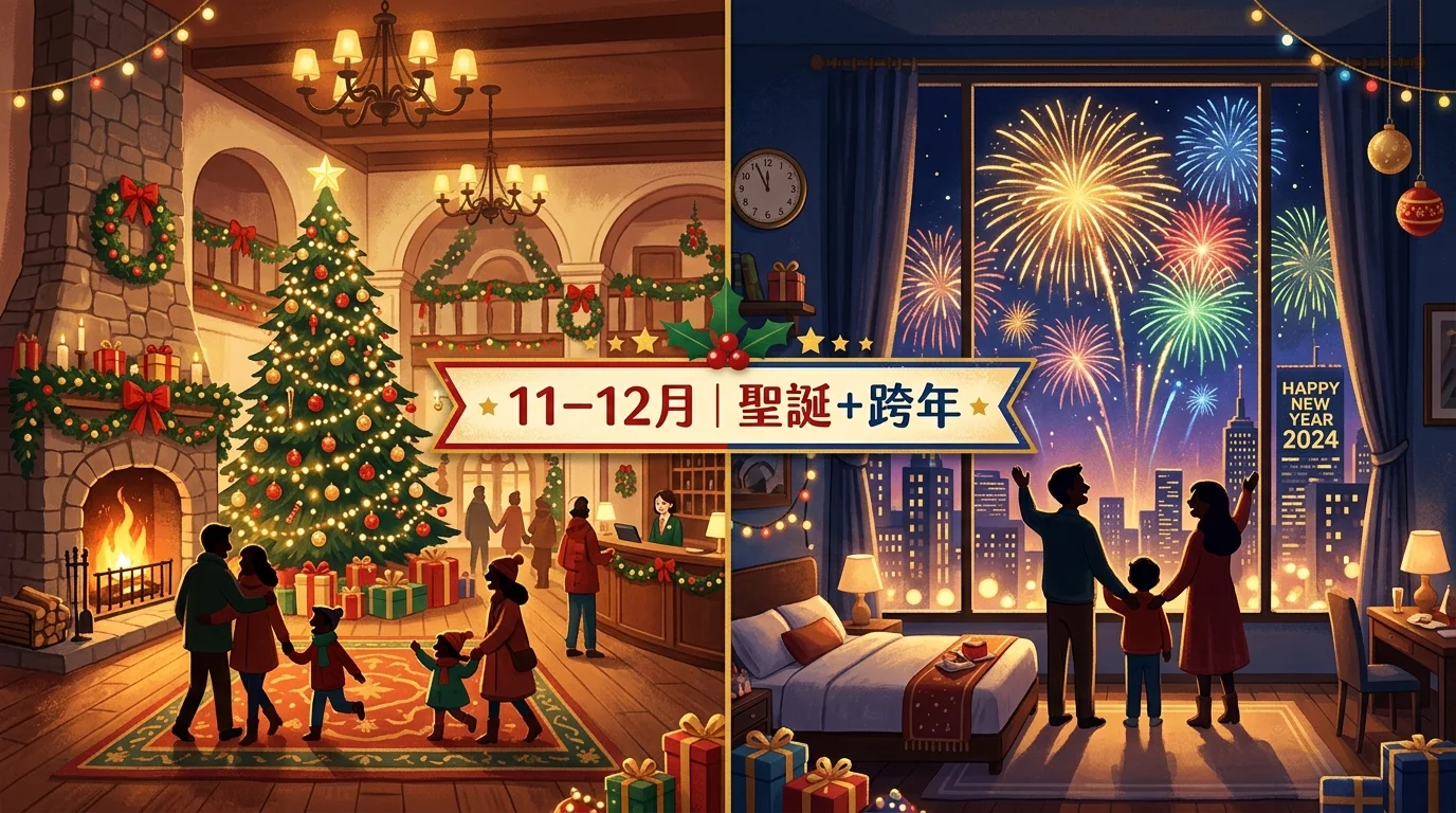 跨年住宿是全年需求最集中的一天。12/31 的房價通常翻 2–3 倍。提前用票券鎖價是唯一解。