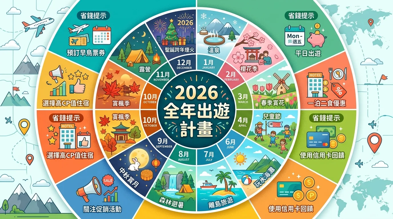 台灣一年到頭都有連假,從春節到跨年,幾乎每個月都有出遊的好理由。問題不是「要不要去」,而是「怎麼提前準備,才不會被房價嚇到」。這篇幫你把 2026 整年的旅遊時機、推薦玩法、住宿省錢技巧全部整理好,存起來慢慢用。