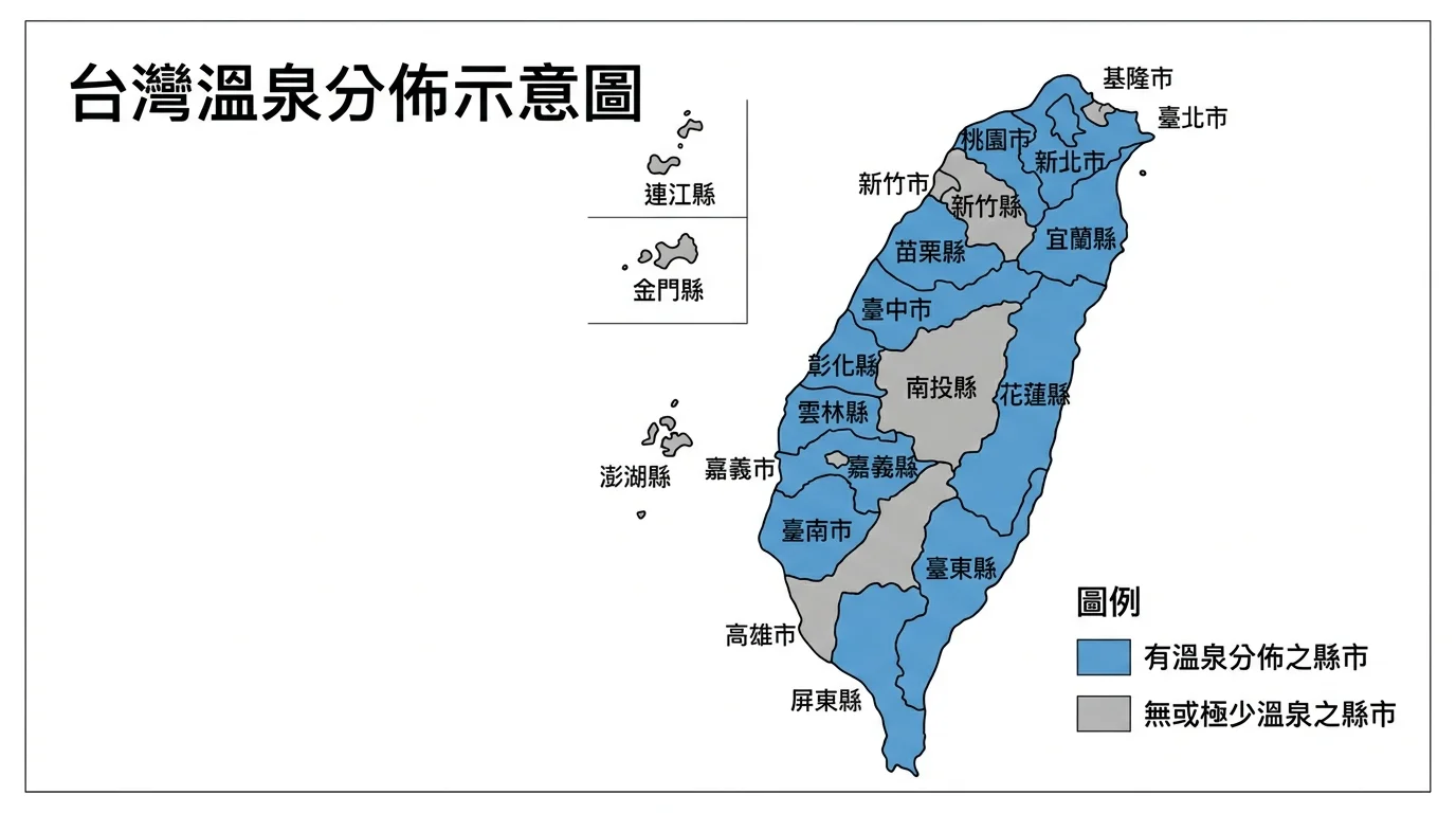 A: 彰化、雲林等位於嘉南平原的縣市因地質條件不同(平原地層厚、火山活動少),溫泉資源相對稀少。但台灣大部分的縣市都有溫泉分布,尤其是山區和火山帶附近。