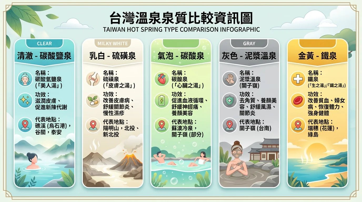 我們實際體驗過全台五種主要泉質,把各自的觸感、功效和適合膚質做了完整比較。泉質不同,泡起來的感覺也不同。選對泉質,泡湯體驗會好很多。