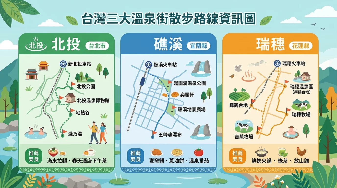 你知道台灣全島有超過 130 處溫泉露頭嗎?從台北市區 30 分鐘就能到的北投,到要搭火車轉車才能到的花蓮瑞穗秘湯,每個溫泉區的泉質、風景、體驗都截然不同。到底哪裡的溫泉最特別?碳酸氫鈉泉和硫磺泉差在哪?